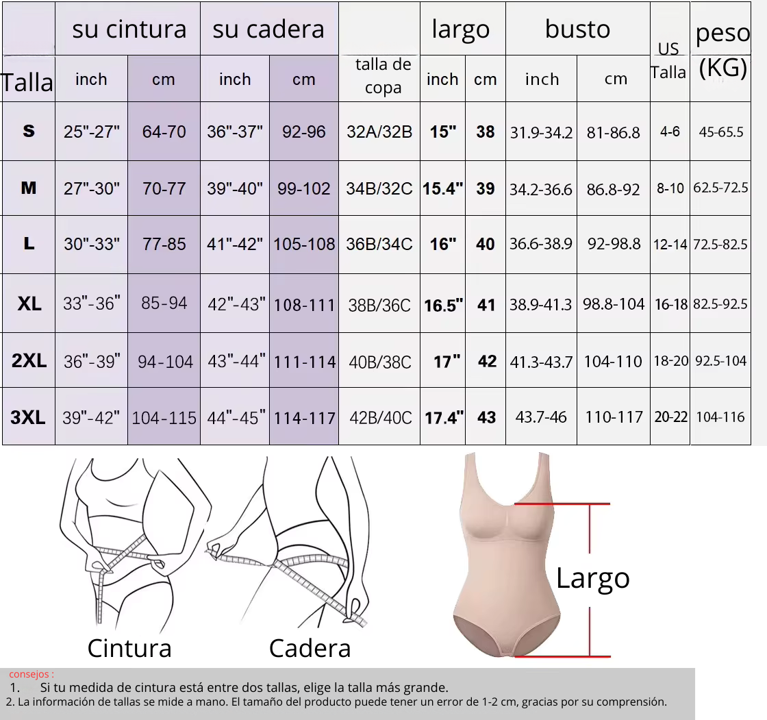 Te recomendamos consultar nuestra guía de tallas disponible en cada página de producto. Mide tu cintura, caderas y busto, y compáralas con la tabla. Si estás entre dos tallas, elige la más grande para mayor comodidad.